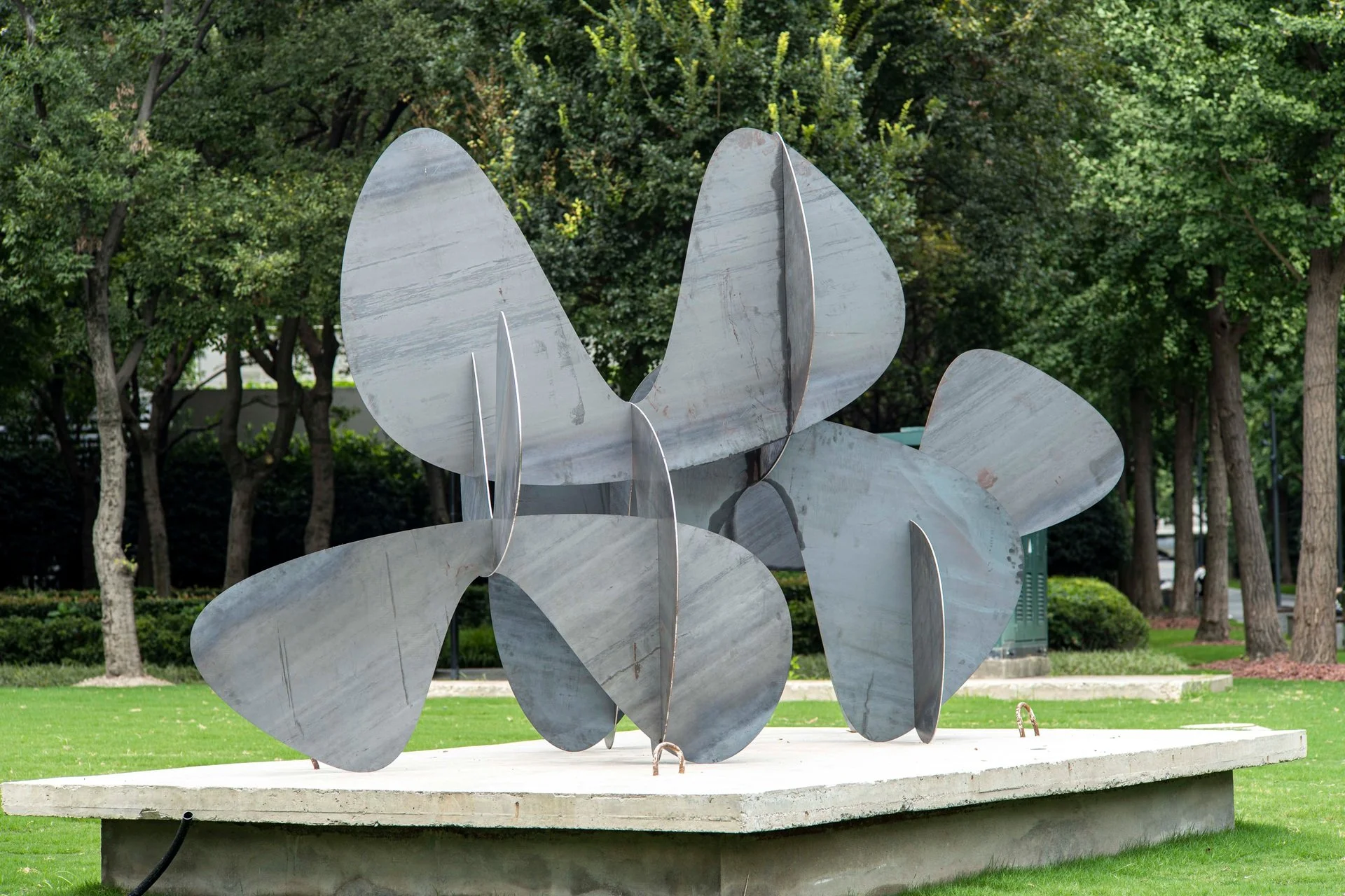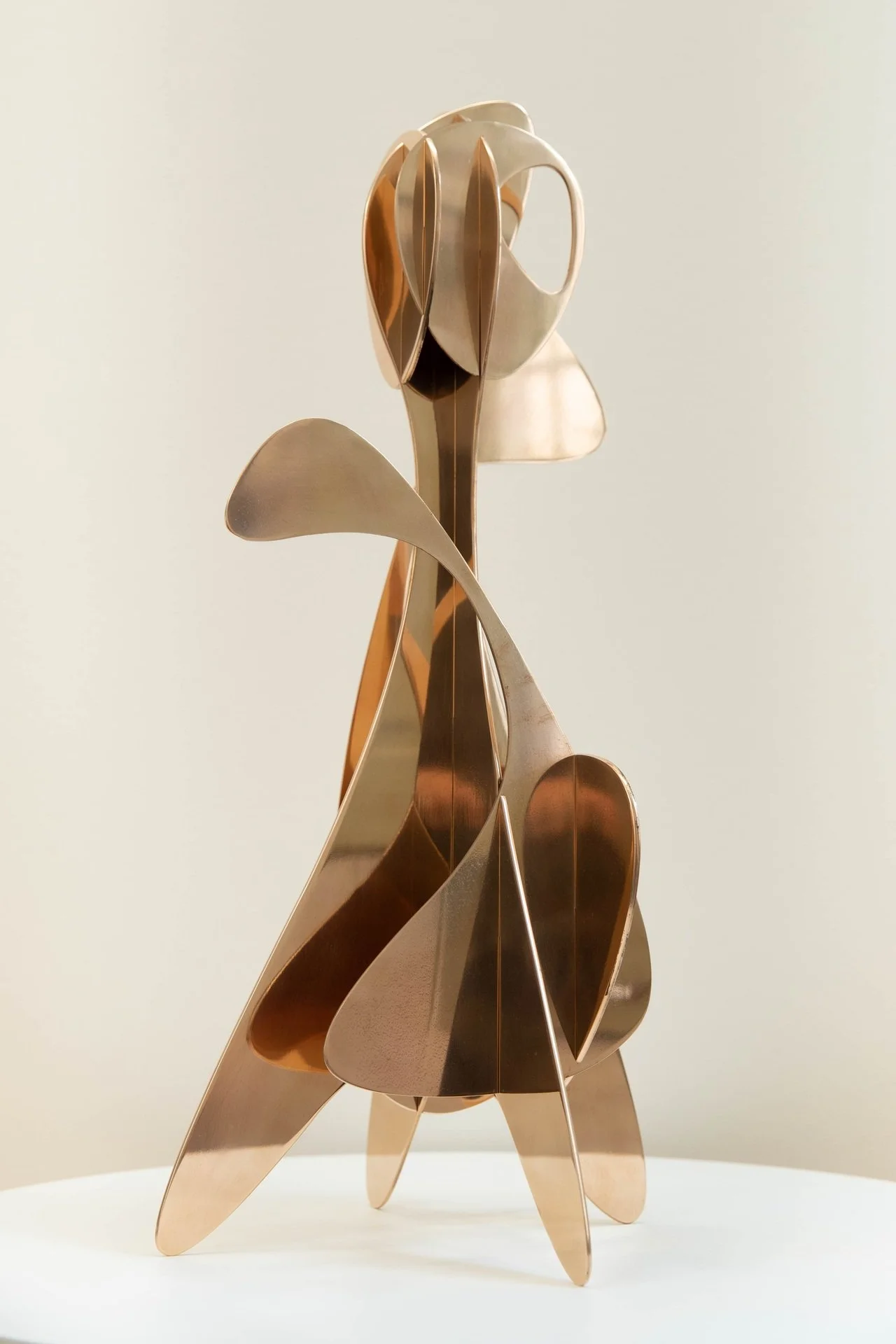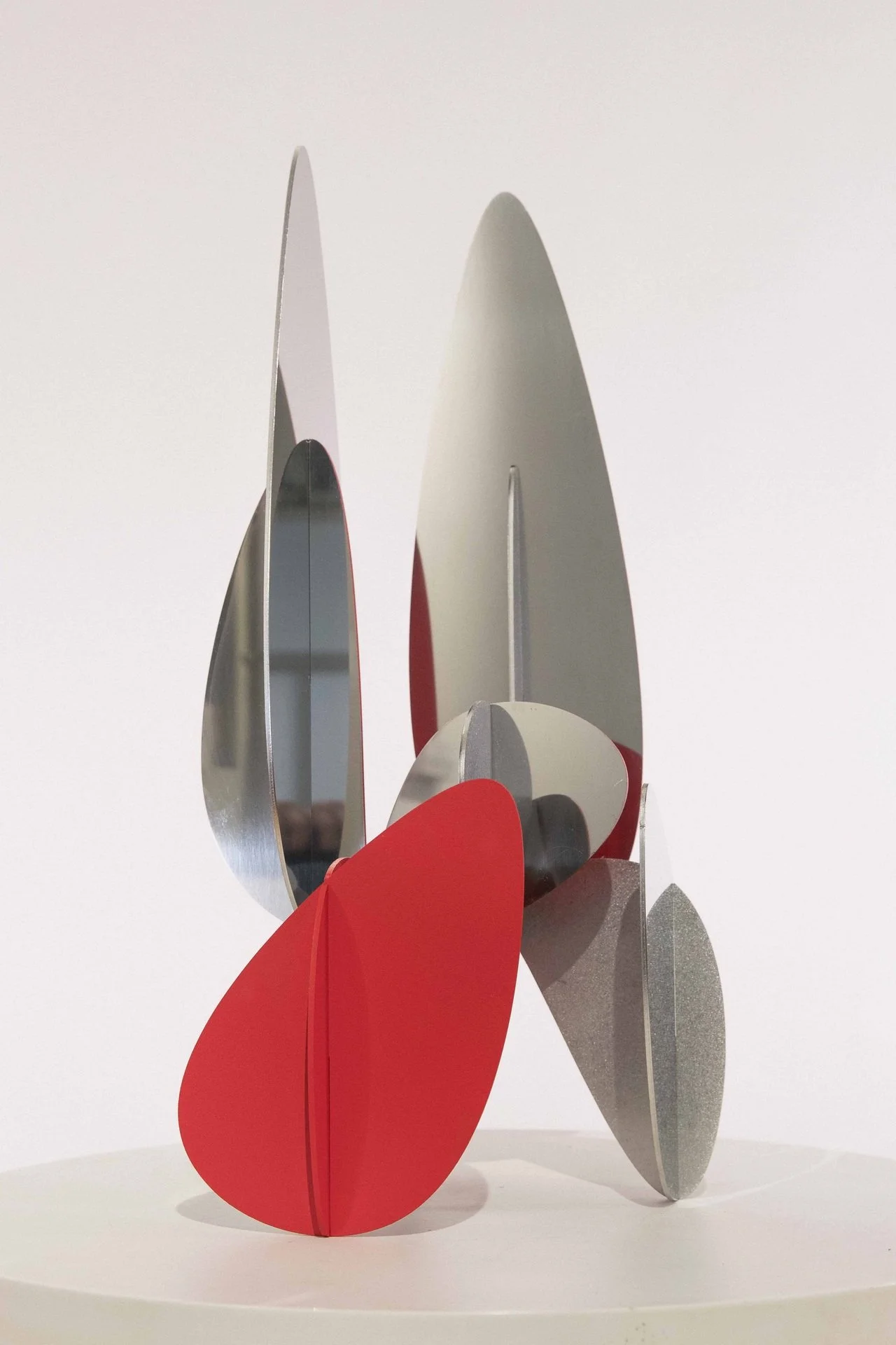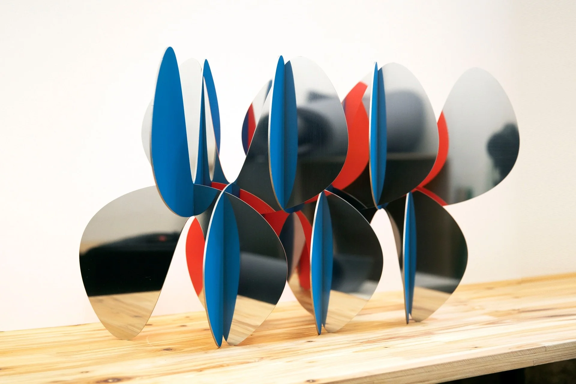 The shapes for his sculptures are made from metal sheets that are laser cut using digital drawings, then assembled. This assembly stage is key as it is where the sculpture is truly constructed to create a new sense of volume. Although Alejandro Vega Beuvrin initially used iron sheets, his choices of materials have led to technical and aesthetic experimentation, with iron, bronze, corten steel, wood and acrylic all used to create his characteristic designs. His favourite material remains stainless steel because it can be polished, which opens up a range of aesthetic possibilities to explore. He creates polished sculptures with reflections that encourage the viewer to think about the relativity of their outlook and create a vibratory effect reminiscent of sculpture’s kinetic tradition.