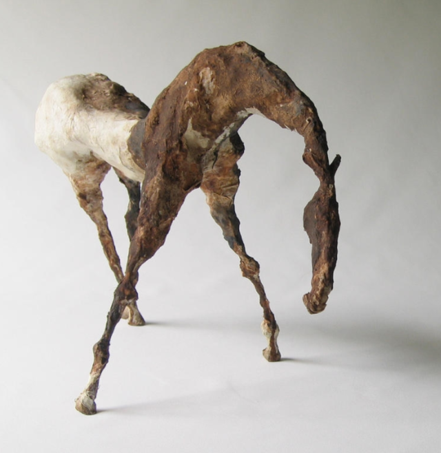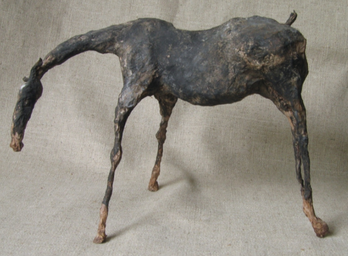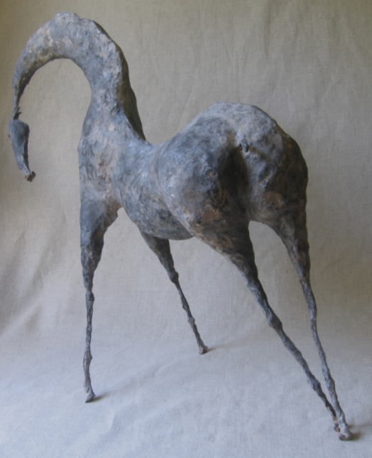 For approximately 30 years, I painted. I loved oils. Oil on wood, oil on linen canvas, oil on paper (many landscapes with animals, people and roads) . Because of allergies I switched to watercolors which I also grew to love. I tried to love acrylics but it was a struggle. During that love/ hate relationship with acrylics I rediscovered paper maché. When I look back at those firstpaper horse sculptures I wonder what in the world I was finding so fascinating. I couldn’t stop, I couldn’t wait to get up in the morning to see how the previous day’s work had dried and then to begin again, a day of layering paper. This went on for a good three years, 10 hours a day, seven day a week. The horses evolved. I did make a conscious decision to work only with the horse (and human) form. There were a dozen or so cows, dogs and turtles but I would quickly grow tired of them. My fascination for the horse seems endless. Why? Maybe I don’t want to know why though maybe faithfulness to the horse, to their muscle, their skin, their bone, their movement, their stillness, their grace, their humour, all parts of the same form, gave me a freedom to allow my hands and mind to dance.