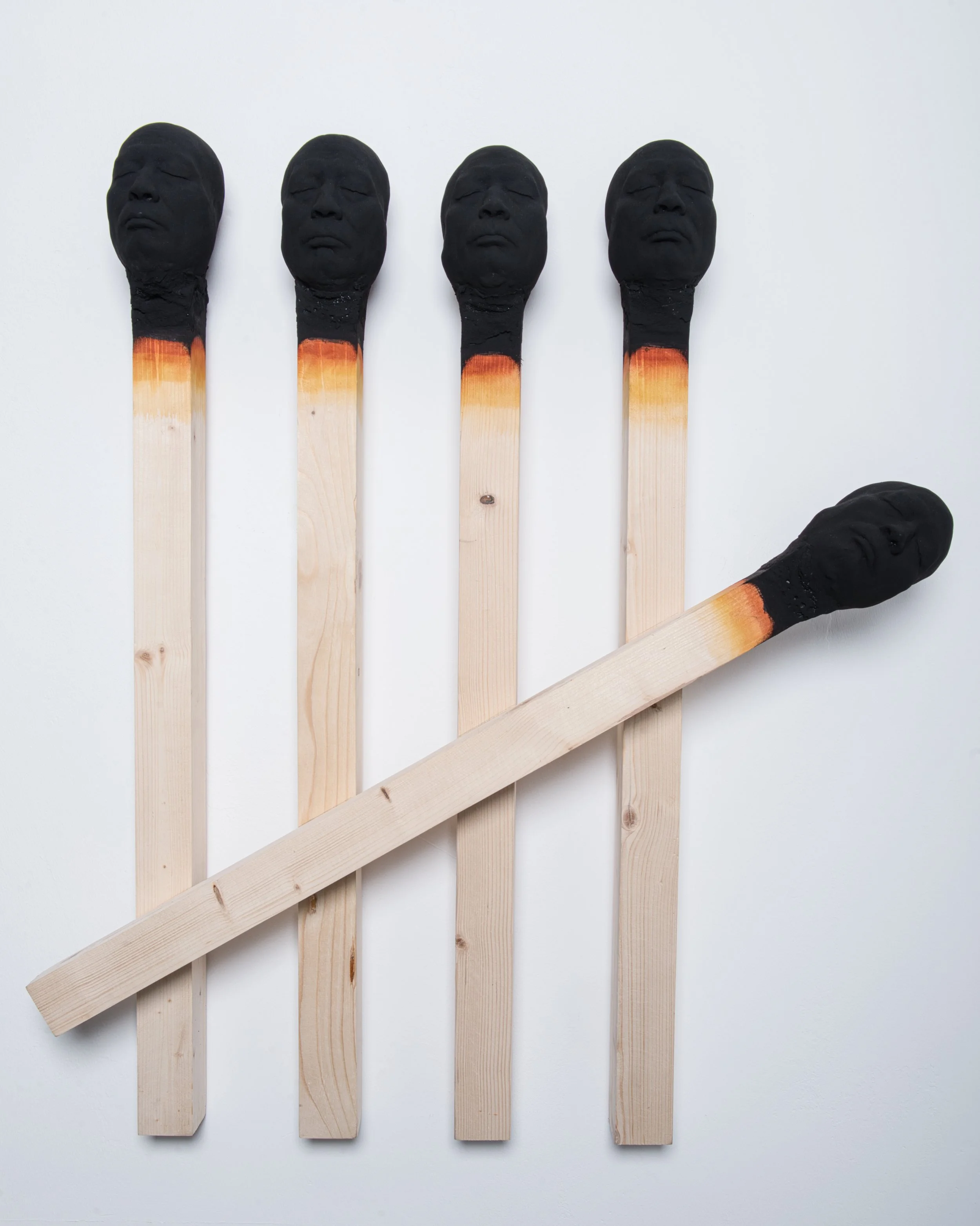His most iconic project, the Matchstickmen, introduces the human figure as both symbol and narrative. These charred, oversized matchstick sculptures comment on burnout, human expendability, and the waste of human resources, while retaining a playful, humorous edge. The installation feels simultaneously light and profound, a reminder of how we ignite, burn, and scatter across the world we inhabit.