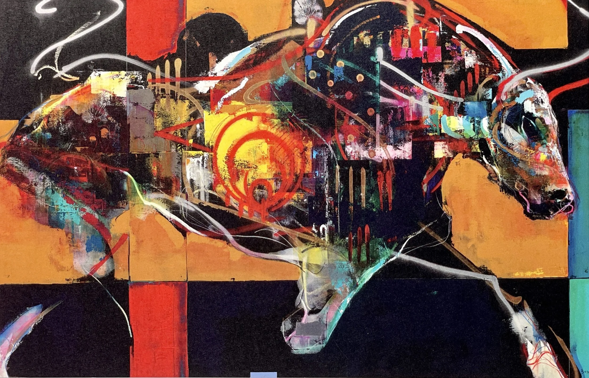 Animals also feature heavily in Besner’s work, serving as symbols of humanity’s deepest passions. These creatures reflect the raw, powerful forces that shape life—whether it’s the playful or the fierce. Set within Besner’s vibrant, chaotic cities, the animals remind us of the intensity and energy of the world around us.