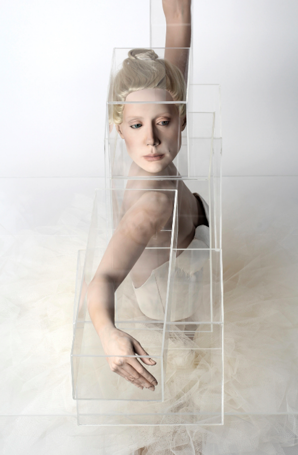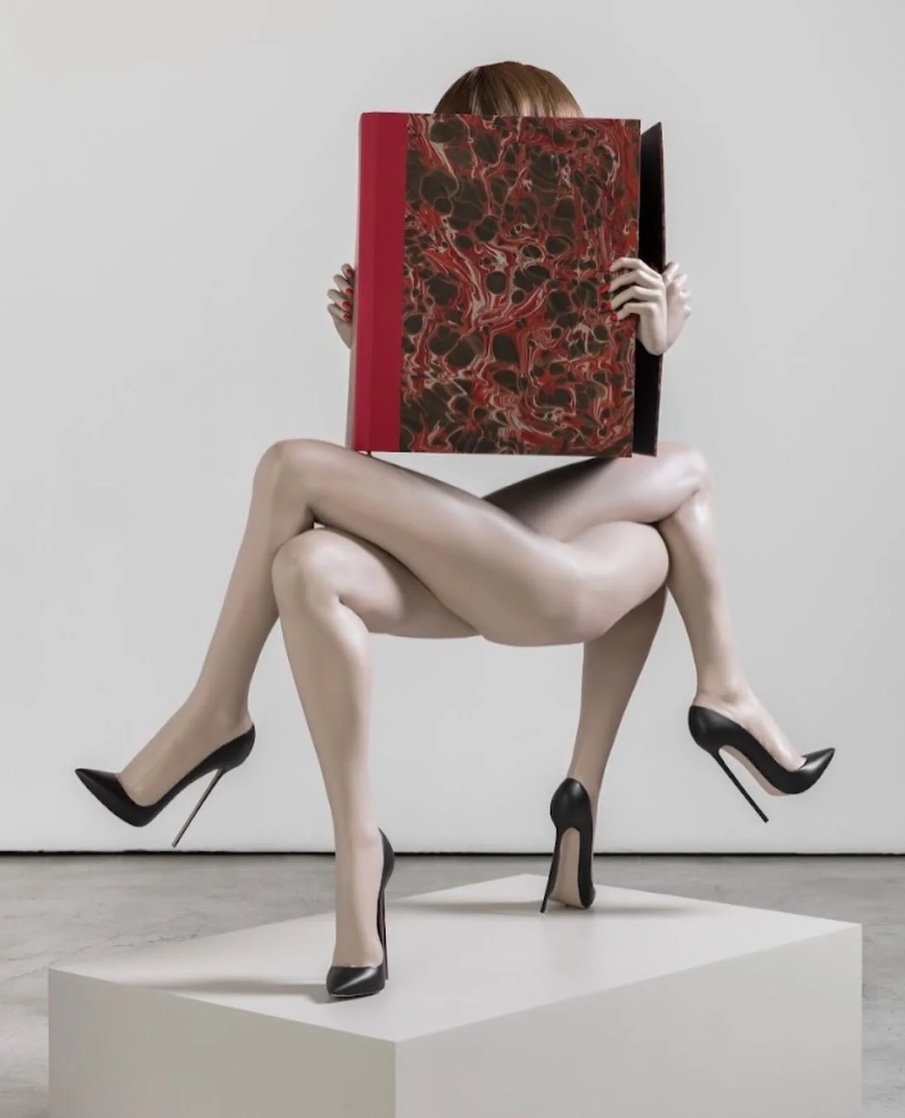 Looking at the whole of the artist's work, we are confronted with a kind of cabinet of curiosities, populated by representations that explain a fragmentation and a dismemberment of beauty in a universe formed by a character often without face, whose openings do not shed organs or viscera, but an empty discomfort. In this series, the figures reveal something rather apprehensive and vaguely erotic. The female bodies are grounded on a fetish symbol, which makes them vulnerable and unstable, for on a leap from such height no body can run or escape, if necessary. A precarious balance, becoming hostage of an image, supports the wandering, and the artist herself admits a certain tension under the glamour surface that radiates from her work. After all, some of the sculptures reveal a kind of emptiness where we suppose there is the fullness of forms. When we decide to look for interiority, a nucleus with an identity, what we find is an absence similar to the non-existent content of a book that only reveals itself by its cover, a kind of screen that hides an absent body. But curiously it is this same void that gives support to the figures that seem to levitate in the air as if supported by an invisible force that makes those bodies even more fragile and light.