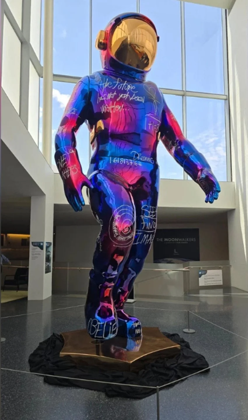 Suspended beneath the Welcome Pavilion as part of the “A Giant Leap” art initiative, the chrome figure doesn’t just reflect the surrounding architecture—it reflects the people who walk beneath it. It invites wonder. It celebrates ambition. And it stands as a luminous tribute to the connection between artistic vision and scientific discovery.