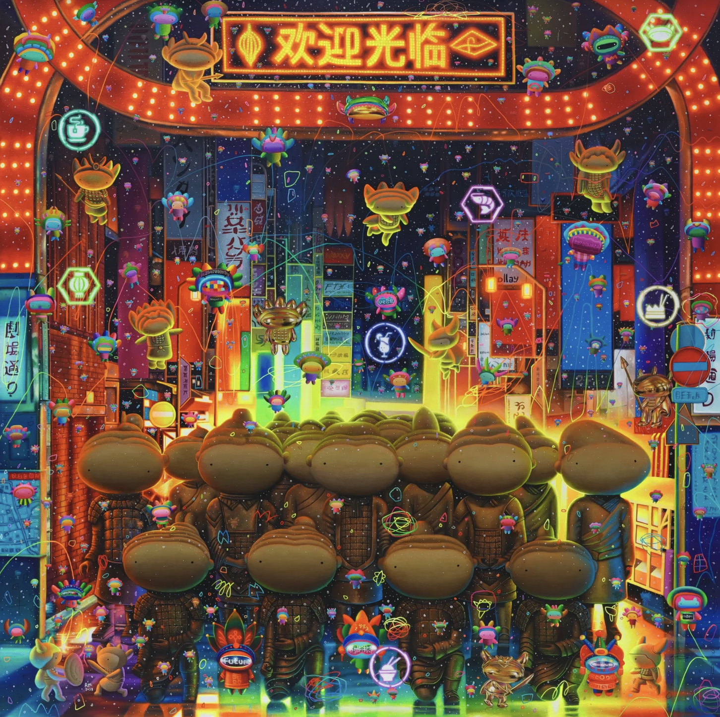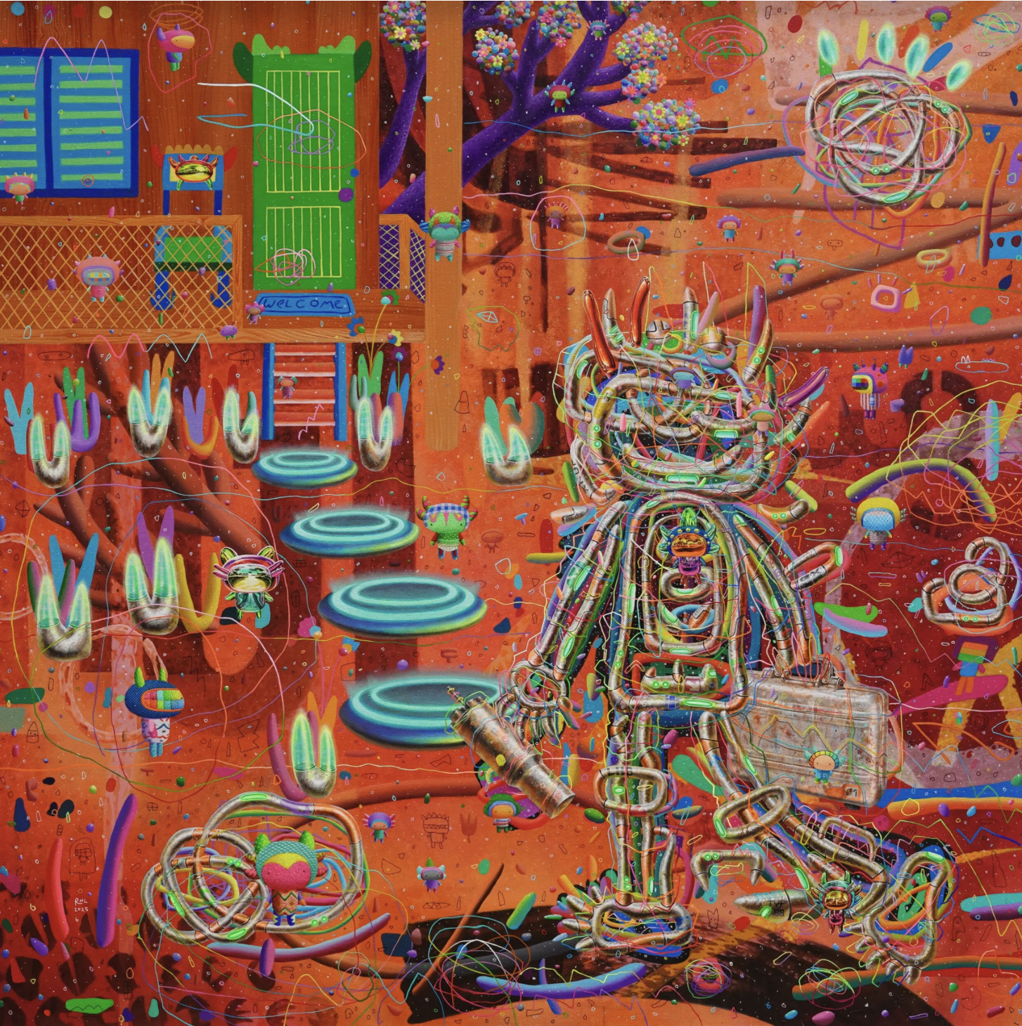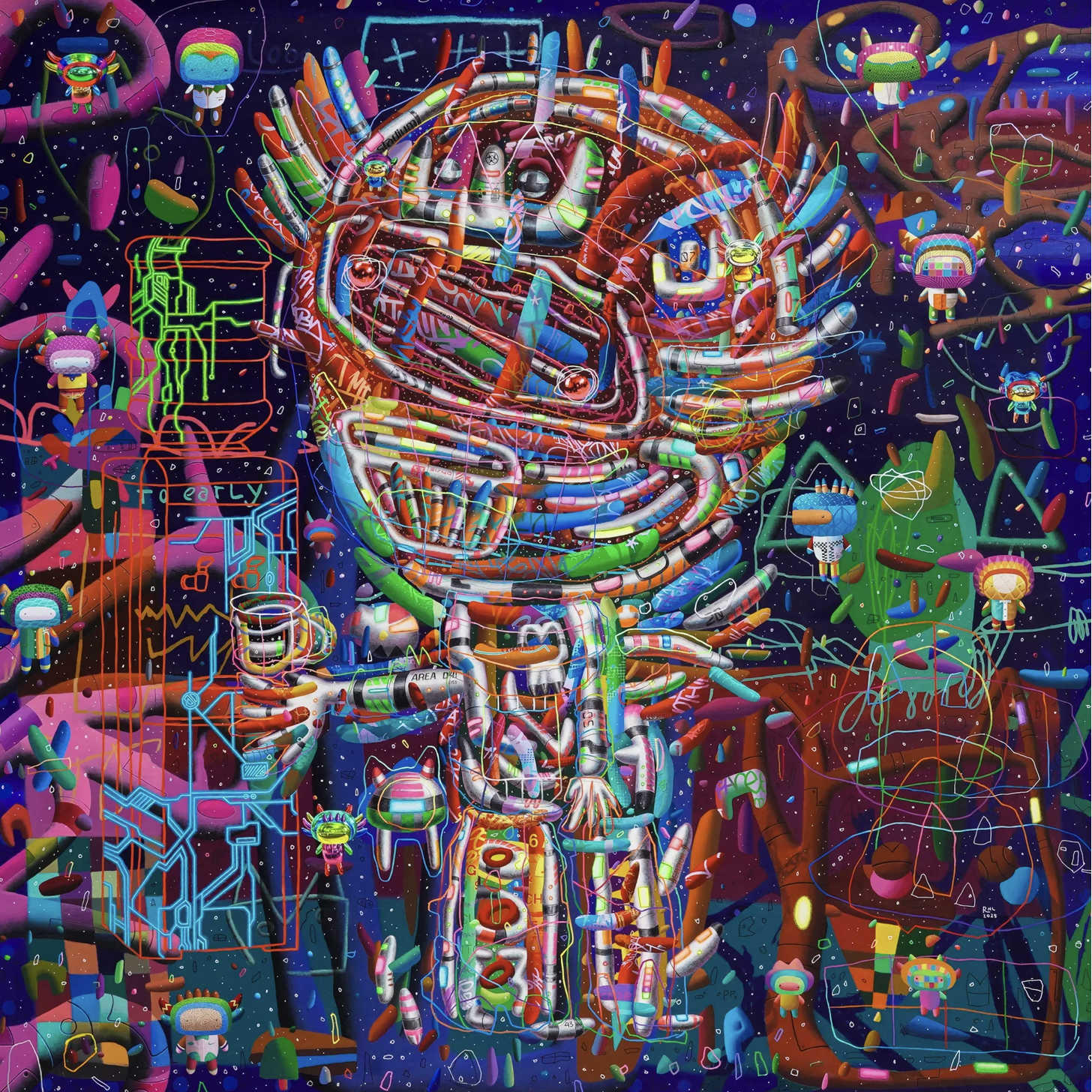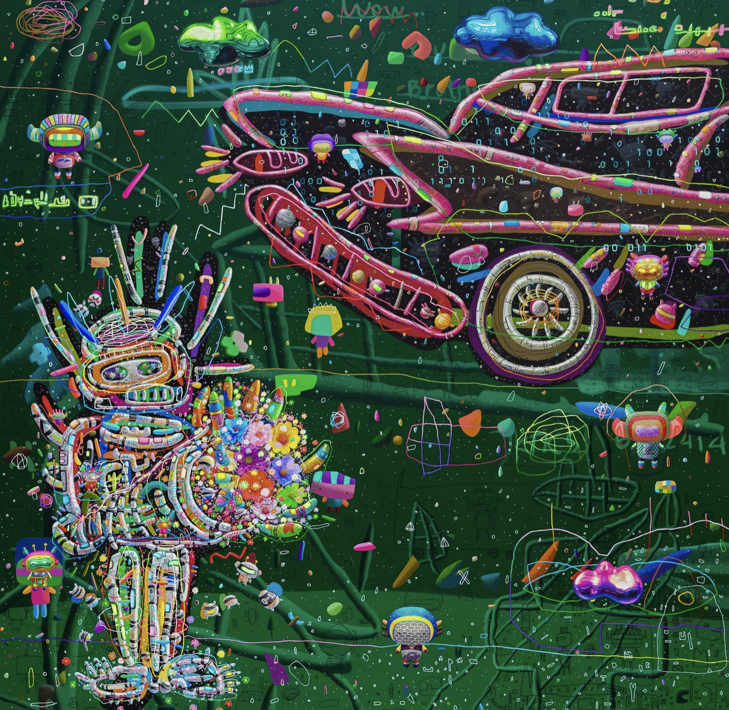 At first glance, Apriyan’s work feels playful. Bright colors, animated characters, and layered linework create scenes that appear almost childlike in their spontaneity. Yet the longer one spends with the paintings, the more nuanced they become. Beneath this sense of play lies a deeper reflection on contemporary life, particularly the emotional landscape of individuals navigating rapidly changing urban environments.