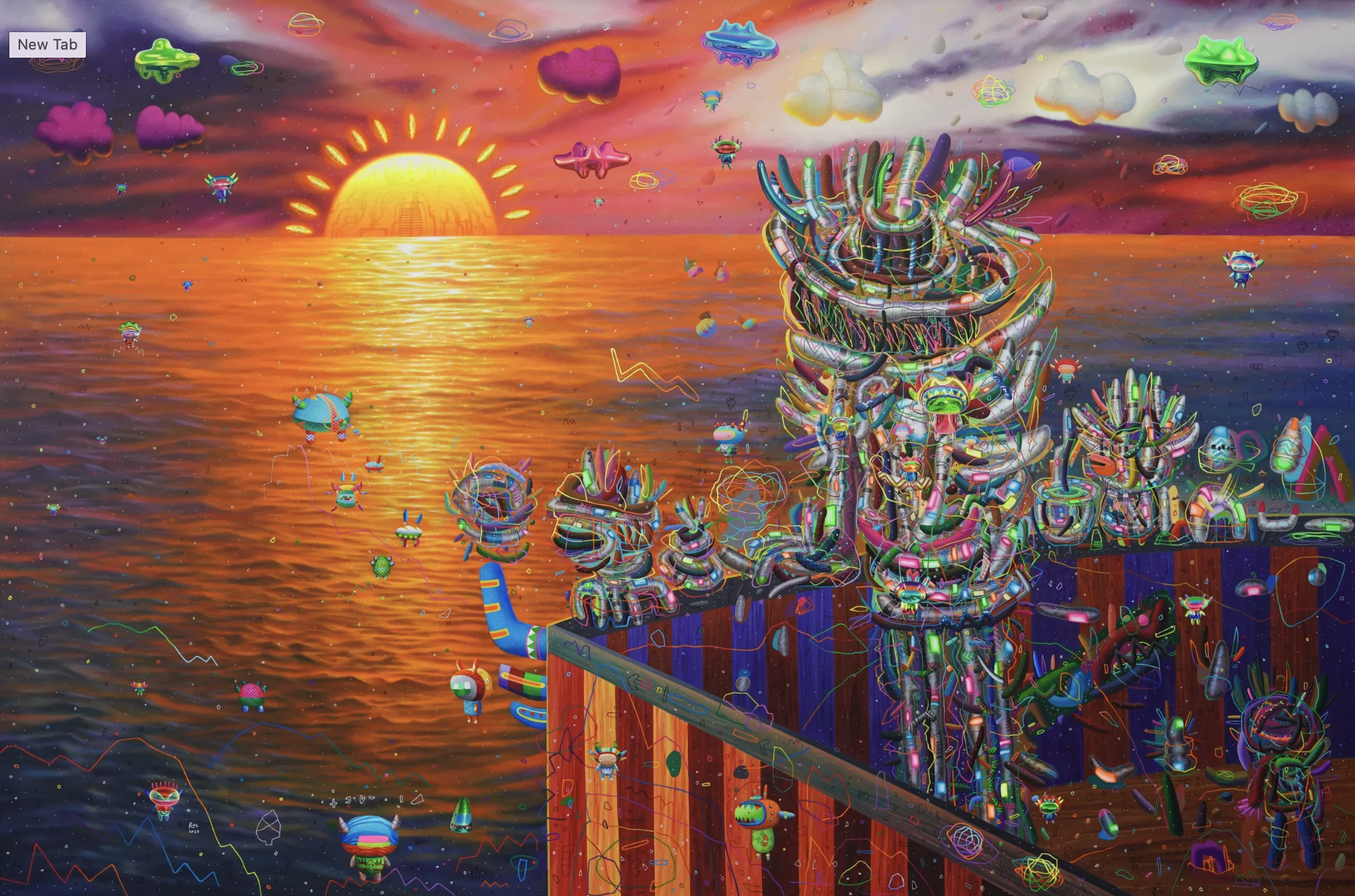 One of the most compelling aspects of his practice is the way each painting functions almost like a living ecosystem. The compositions are layered with countless details, gestures, expressions, architectural fragments, and symbolic elements that interact across the canvas. No single focal point dominates. Instead, the viewer’s eye is encouraged to wander, discovering new relationships and narratives with each viewing.
